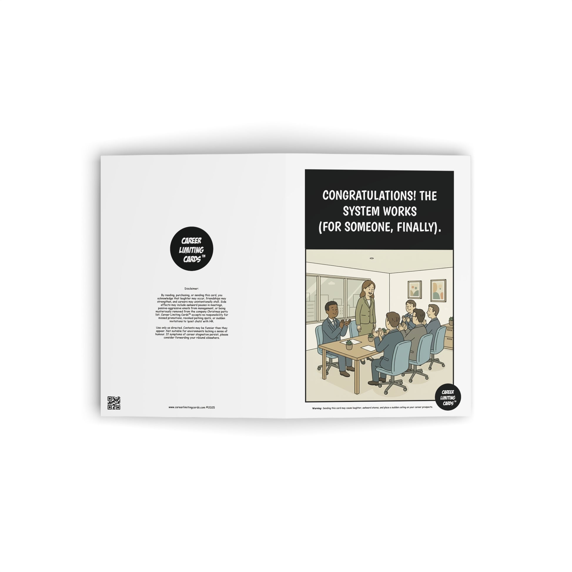 This design — “Congratulations! The system works for someone, finally.” — perfectly captures the joy, chaos, and sarcasm of modern office life.