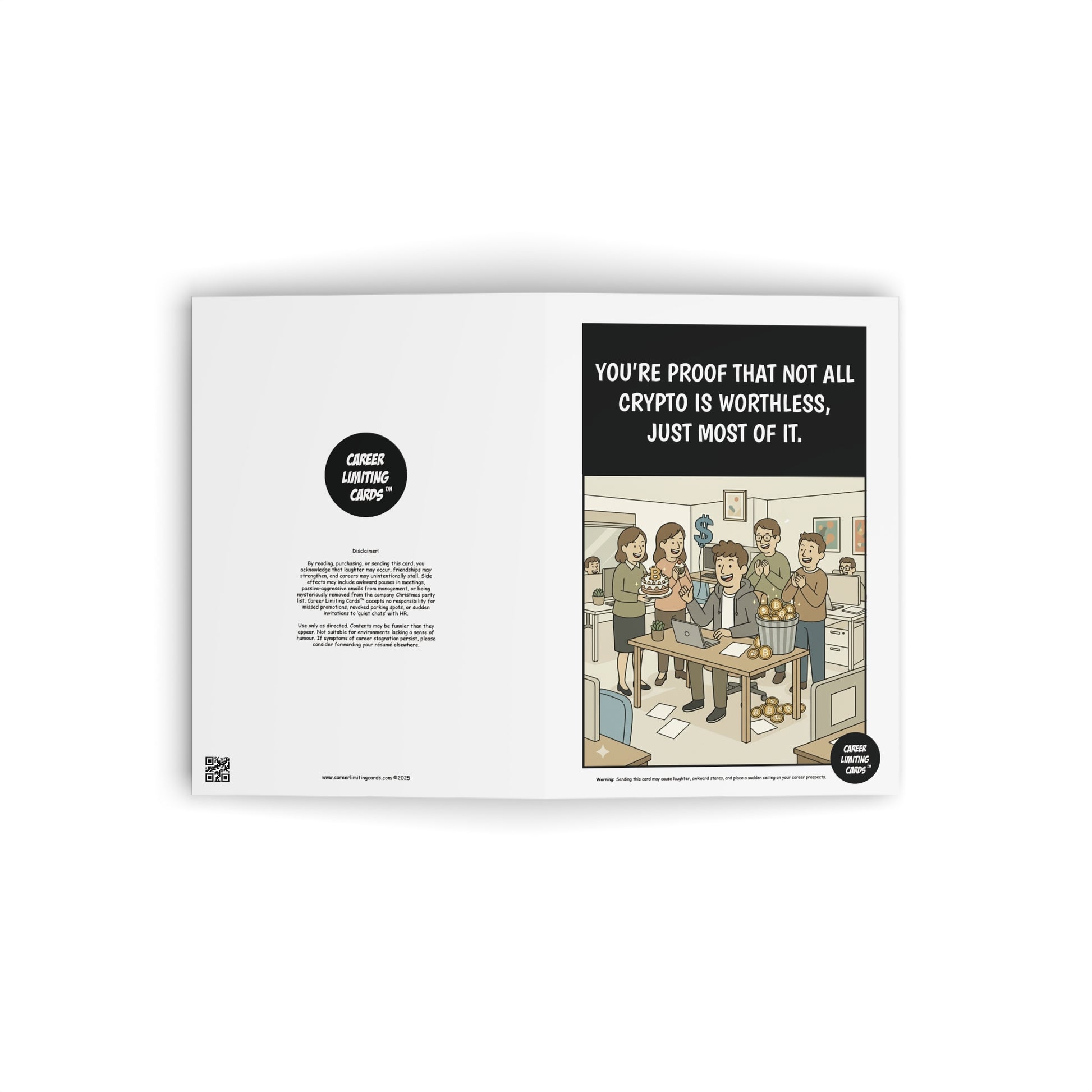 This design — “You’re proof that not all crypto is worthless just most of it.” — perfectly captures the joy, chaos, and sarcasm of modern office life.